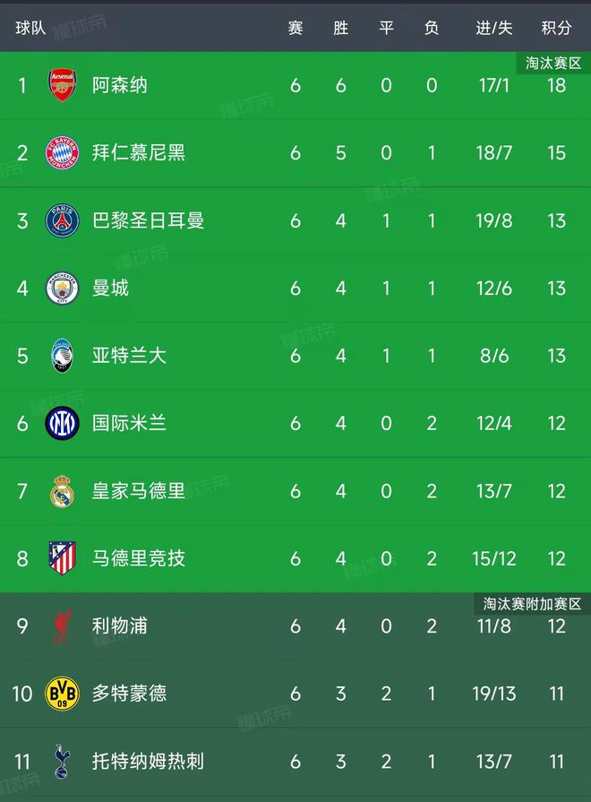 欧冠最新积分榜阿森纳是唯一保持全胜的球队,客场3-0战胜了布鲁日,豪取6连胜,以18分稳居第一,马杜埃凯梅开二度,马丁内利世界波破门。本赛季的枪手在英超和欧冠都是领头羊,但是随着赛季的深入,他们肯定会遇到更多的困难和压力,最重要的就是要保持稳定和信心。