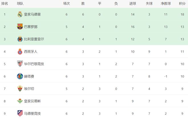 在积分榜上,皇马非常强势,6战全胜以18分排名榜首。巴萨13分紧随其后。巴萨落后5分,但比皇马少踢1场。比利亚雷亚尔也是13分,排名第3。第4的是西班牙人,拿到11分。毕尔巴鄂竞技和赫塔费都是10个积分。而马竞赢下比赛之后,战绩是2胜3平1负,总积分9分,排名第9!马竞已经掉队,要想冲击冠军很难很难。