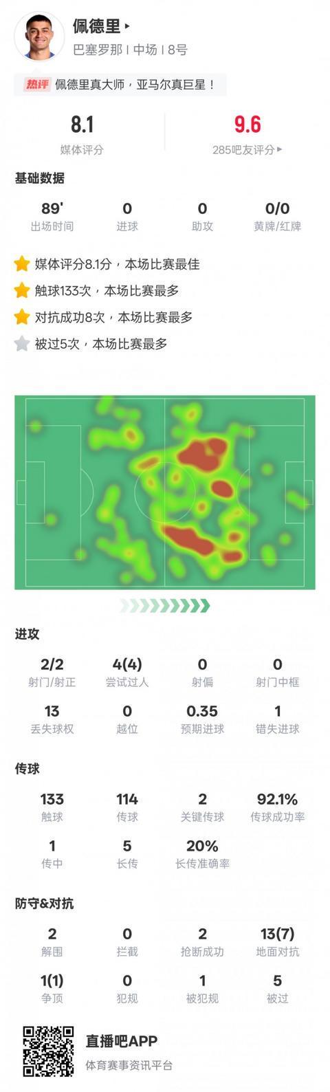 9月29日讯 2025-26赛季西甲联赛第7轮,巴萨2-1皇家社会,佩德里首发出战,打满全场,赛后当选全场最佳球员。本场比赛,佩德里送出2次关键传球,4次过人均成功,传球成功率92.1%,133次触球也是全场最多,还有2次解围和2次抢断。