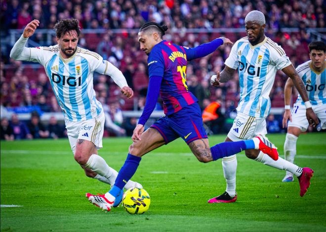 下半场开始仅仅7分钟,奥维耶多后卫出现严重失误,亚马尔断球后送出助攻,奥尔莫的低射打破僵局。