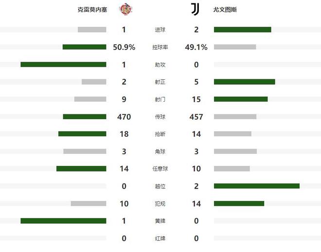重新回到赛场之后,尤文在第58分钟由弗拉霍维奇和科斯蒂奇连续完成攻门,但都被克雷莫内塞的后防化解,不过第68分钟狂攻不止的斑马军团,还是扩大了领先的优势,队友下底传中被破坏后,坎比亚索禁区内补射建功,将比分改写为了2-0。虽然2球落后的克雷莫内塞没有放弃,并且在第83分钟后场长传助攻瓦尔迪单刀破门追回一球,但余下的时间,没有能够再度取得进球追平比分,只能接受1-2输球的结局。