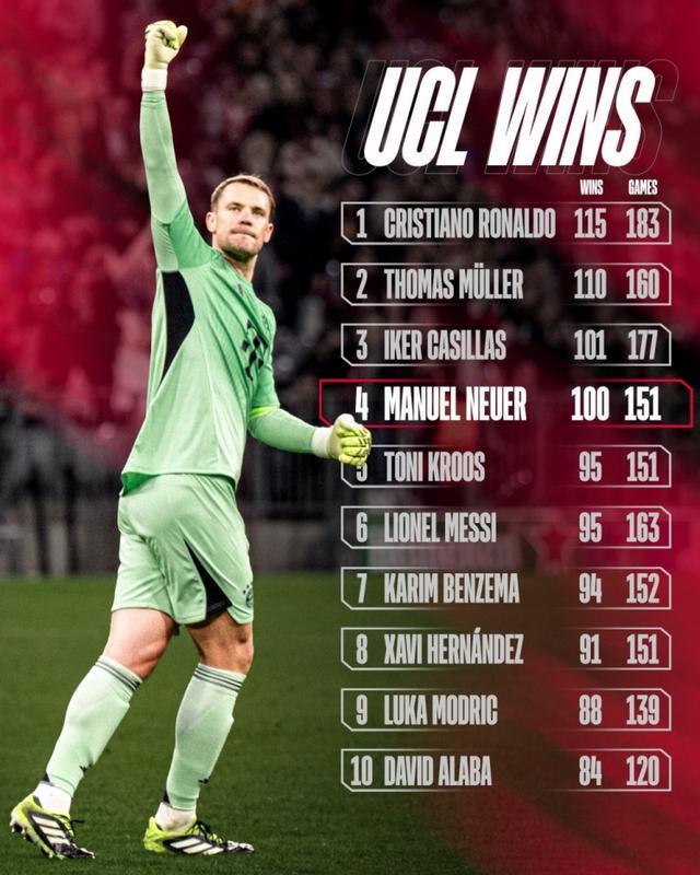 能否超越C罗115胜纪录拜仁官方晒欧冠胜场榜:诺伊尔100胜列第4