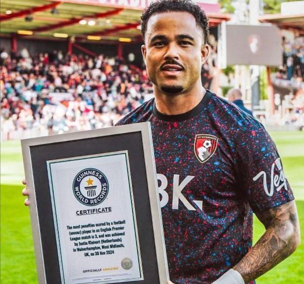 英超单场比赛中三次站上点球点并全部命中。最终,吉尼斯世界纪录官方认证了荷兰中场的“