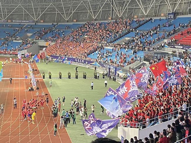 四分之一决赛之火爆,令人叹为观止。打平就点球,输球就出局,进一步刺激了球迷现场观赛的欲望。本轮比赛,南京对连云港观赛人数为61355人,中签率6.7%;徐州对泰州为30336人,中签率4.5%;南通对淮安为32069人,中签率低至3.3%。加上盐城对无锡的比赛,四场苏超淘汰赛的总入场人数为158456人,参加预约抽签的总人数约为3204183人次,最终只有约4.9%的幸运儿达成所愿,其中不乏首次观看苏超的新球迷。极低的中签率,也使苏超比赛中出现了一些有意思的画面。10月5日晚上徐州对泰州的比赛进行到点球大战时,徐州队球员主罚射失,电视镜头捕捉到看台上站着看球的一对身着宿迁队球衣的夫妇,他们手里拿着的是“徐州加油”的围巾。在他们的身后,还有淮安球迷和南京球迷。记者在盐城奥体中心观赛时,也遇到了连云港、南通球迷。还有一对球迷夫妇,先生身着连云港球衣,女士身着盐城球衣,“红蓝配”成了一幅温馨画面。在盐城感受苏超文旅江苏球迷观赛可以顺便旅游,享受省内其他城市的景点优惠。但球迷需要先看自己能够中签哪一场比赛的球票,届时顺便打卡景点,寻找美食和地方文化产品。以盐城为例,记者在盐城站一下高铁,就根据指示和工作人员的提醒,找到了直达盐城奥体中心的球迷免费巴士。巴士间隔时间为15分钟,工作人员甚至都不需要查验记者的球票,仅凭记者身着的盐城队球衣,便引导记者上车。在下午3点抵达盐城奥体中心时,记者看到长长的市集摊位已经摆起,餐饮、文创、纪念品、非遗、景区宣传等各类产品已在迎接来客。