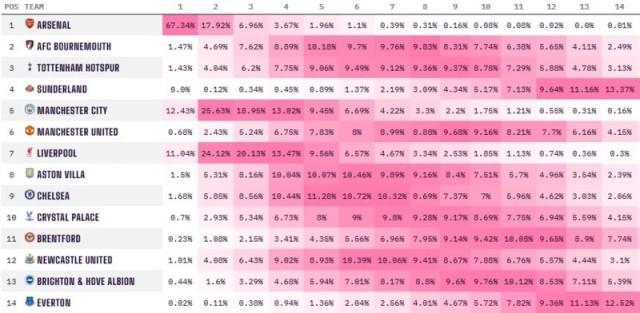 英超积分榜第二位的伯恩茅斯则仅为1.47%,与暂列积分榜第三的热刺(1.43%)相差无几。本季