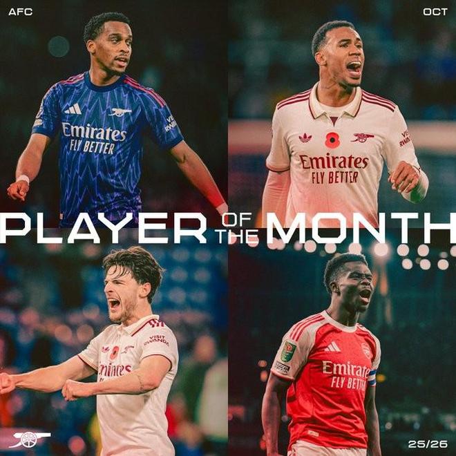 在10月,阿森纳的战绩为6战全胜,并且全部保持零封。阿森纳10月最佳球员候选加布里埃尔(出场6次,打进1球,助攻2次,后防线零封6次)赖斯(出场6次,打进1球,助攻1次)萨卡(出场6次,打进4球)廷贝尔(出场6次,后防线零封6次)【上咪咕独家看
