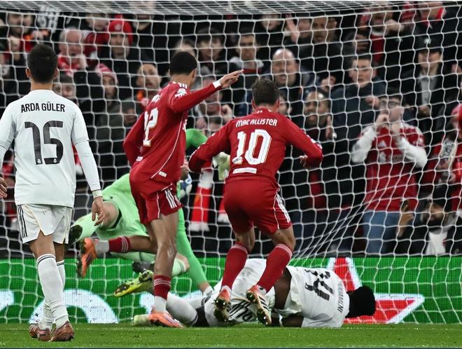 下半场回来利物浦依然牢牢将皇马压制,在之后的2次角球进攻当中,范戴克与埃基蒂克先后近距离头球攻门,库尔图瓦2次无解神扑将利物浦的进球拒之门外。第52分钟,索博斯洛伊任意球攻门,库尔图瓦侧身飞扑再次扑救;只是双拳终究是难挡四手,第61分钟,索博斯洛伊右侧斜45度精准传中,麦卡利斯特中路抢点头球入网,1:0!