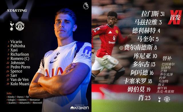 谁能想到,上赛季仅英超第17的热刺和第15的曼联,两队在本赛季踢出良好表现,均位居联赛中上游。弗兰克此战采用4231阵型,派上穆阿尼单箭头,身后是布伦南-约翰逊、哈维-西蒙斯和里沙利松。阿莫林依旧用343阵型,库尼亚突前、姆伯莫和阿玛德-迪亚洛紧随其后。从过往交手来看,热刺5胜2平3负更占上风,上赛季各项赛事对曼联4连杀。