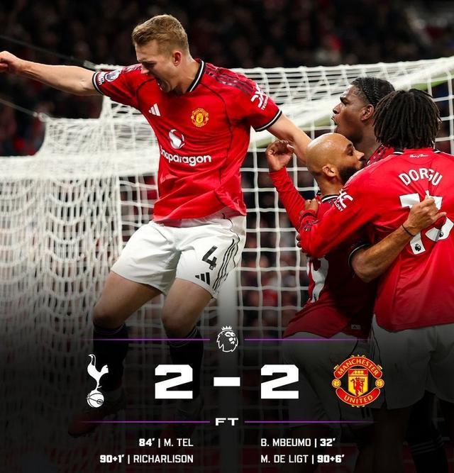 全场比赛结束,热刺主场2-2战平对手,11轮积18分暂时位列英超第5。凭借德里赫特的读秒绝平,曼联成功在客场拿下1分,虽说遭遇2轮英超不胜,但也保持5轮不败,11轮积18分排在联赛第8!