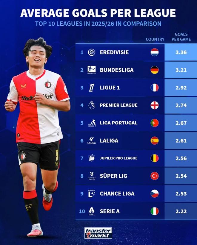 欧洲前10联赛场均进球:荷甲3.36球第1,意甲2.22球垫底