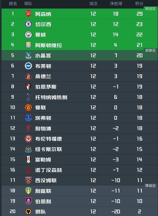 目前,英超的形势就是阿森纳一骑绝尘领跑,其他球队则陷入乱战。12轮过后,第2位的切尔西距离第12位的利物浦,只有5分的差距。1场比赛胜负,都可以让排名发生巨大变化。