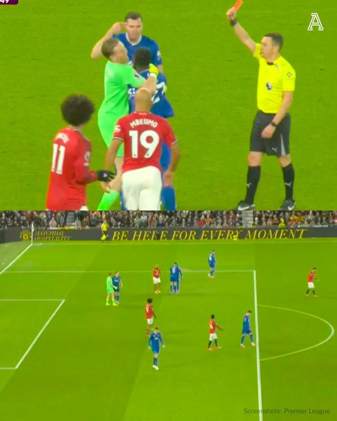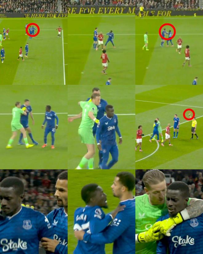 事情起源于曼联队长布鲁诺·费尔南德斯的第一脚射门,葡萄牙国脚将球打偏了。然而,出自曼联青训体系的埃弗顿中卫基恩不满盖耶没有及时回防,后者不甘被骂迅速回应,两位球员互相指责之下发生肢体冲突。盖耶怒火遮眼打了队友一巴掌,随后基恩一掌推开。主裁托尼·哈林顿正好在附近目睹这一幕,他亮出红牌罚下36岁老将盖耶,VAR视频助理裁判保罗·霍华德也确认了这一判罚。基恩此时指着前额,讽刺队友不用脑,盖耶更为愤怒,被门将皮克福德牢牢抱住,才没有做出进一步的过激行为。