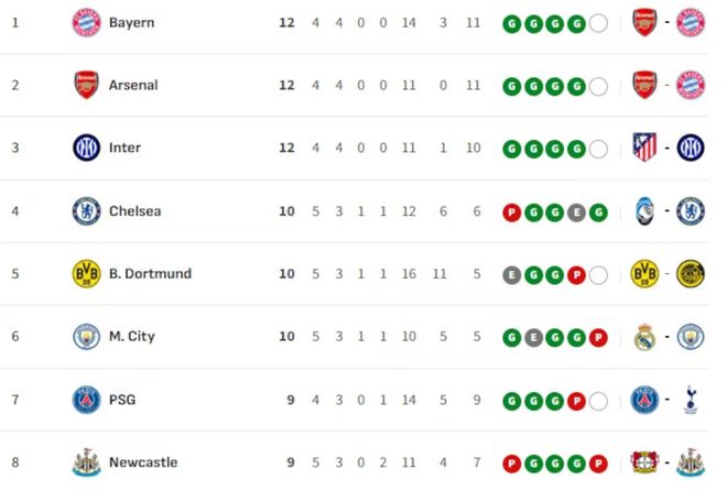 比利亚雷亚尔:奇迹待续黄色潜艇的欧冠回归之旅近乎噩梦:五轮仅取1分,理论最高积分仅10分(需剩余全胜),已低于上赛季季后赛门槛。剩余对手哥本哈根(主场)、阿贾克斯(主场)与勒沃库森(客场)虽存抢分可能,但晋级需要多重奇迹叠加。直接晋级16强球队(当前前8名): 拜仁慕尼黑、阿森纳、国际米兰、切尔西、多特蒙德、曼城、巴黎圣日耳曼、纽卡斯尔联进入附加赛球队(第9-24名): 皇家马德里、利物浦、加拉塔萨里、热刺、勒沃库森、葡萄牙体育、巴塞罗那、卡拉巴赫、亚特兰大、那不勒斯、马赛、马德里竞技、尤文图斯、圣吉罗斯、埃因霍温、摩纳哥最后12名: 帕福斯、布鲁日、法兰克福、毕尔巴鄂竞技、本菲卡、布拉格斯拉维亚、博多闪耀、奥林匹亚科斯、比利亚雷亚尔、哥本哈根、凯拉特、阿贾克斯。