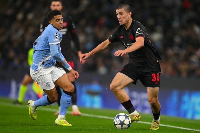 即便是瓜迪奥拉对首发阵容进行了大幅度的轮换,哈兰德、福登等都坐在场下,曼城依旧能占据场上的主动权,勒沃库森踢得相当被动。不过,打破僵局的却是勒沃库森,第22分钟,阿莱克斯·加西亚边路传中,科法内的停球相当舒服,格里马尔多跟上一脚劲射,打破僵局。