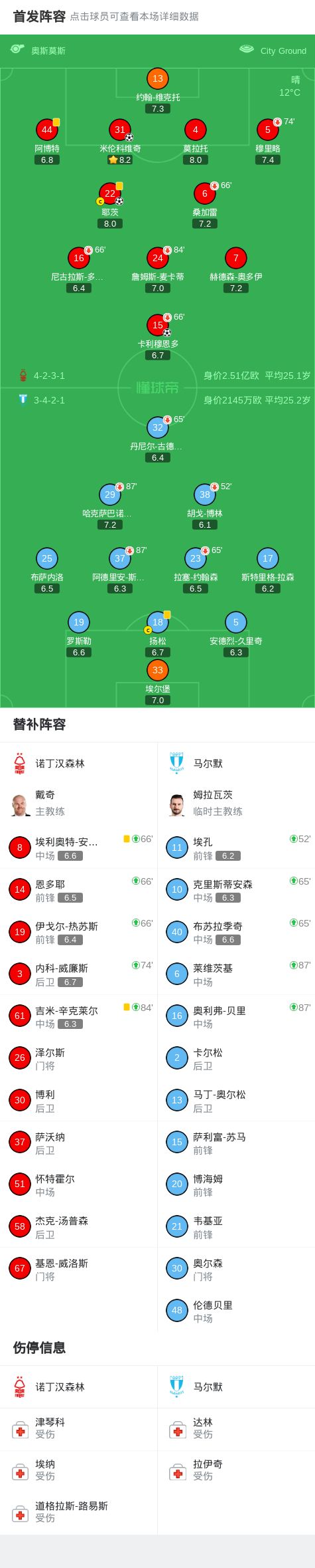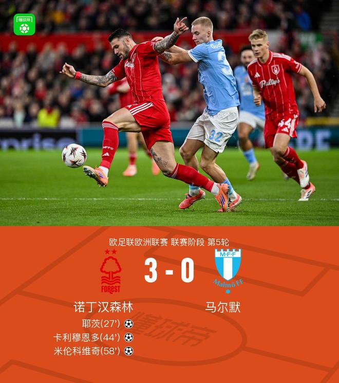 北京时间11月28日,欧足联欧洲联赛联赛阶段第5轮,诺丁汉森林迎战马尔默。比赛中,耶茨率先为球队打破僵局,帮助诺丁汉森林取得领先。随后,卡利穆恩多接队友配合后攻入一球,进一步扩大比分优势。下半场,米伦科维奇在进攻中把握机会,将球送入对方球门,为球队锁定胜局。全场比赛结束,最终比分为诺丁汉森林3-0马尔默。关键事件第27分钟,先拔头筹,耶茨弧顶跟进兜射破门,诺丁汉森林1-0
