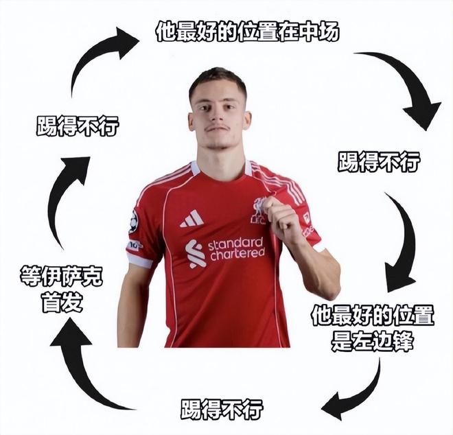 有球迷戏称维尔茨的名字缩写说明了一切(Florian Wirtz缩写是FW),这显然是片面的。维尔茨在利物浦并非完全没有亮点,他的处理球明快,给人一种很有活力的感觉。但恰恰就是之前没有进球也没有助攻,导致大多时候只是看着热闹却没有结果。尤其是维尔茨无论作为左边锋还是中场,他的防守都不达标。如果不能及时进球和助攻,他的踢法又节奏太快,队友必须高速冲刺跑去接球(一旦停顿下来,维尔茨在英超容易对抗吃亏被断球)。一旦跑不动了,本方后场就容易失误。
