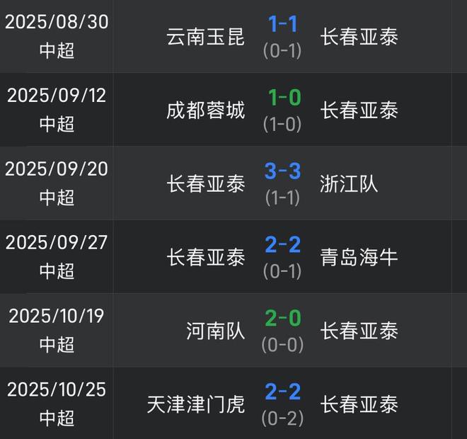雷速体育10月25日讯 中超第28轮,长春亚泰痛失好局,在一度2球领先的情况下,补时阶段被津门虎连入2球,最终双方战成2-2。带着这场平局,亚泰无缘近6轮首胜,目前积19分排名倒数第二。最后两轮比赛,长春亚泰先后在主场迎战北京国安,客场挑战青岛西海岸。亚泰近6轮战绩