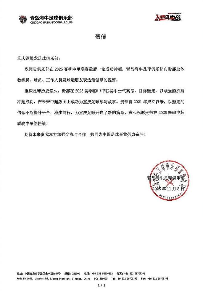 重庆铜梁龙足球俱乐部:欣闻贵俱乐部在 2025 赛季中甲联赛最后一轮成功冲超,青岛海牛足球俱乐部向贵部全体教练员、球员、工作人员及球迷朋友表达最诚挚的祝贺。重庆足球历史悠久,贵部在2025赛季的中甲联赛中士气高昂,目标坚定,以顽强的拼搏冲超成功,在未来中超版图上成功为重庆足球续写故事。贵部自2021年成立以来,以坚定的信念不断提升平台,稳步前行,为重庆足球开启了新的篇章。衷心祝愿贵部在2026赛季中超联赛中争创佳绩!期待未来贵我双方加强交流与合作,共同为中国足球事业努力奋斗!
