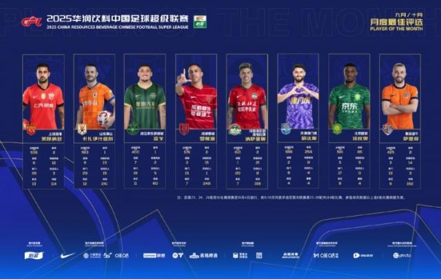 入围本次评选的八位球员是:莱昂纳多(上海海港):8进球2助攻卡扎伊什维利(山东泰山):9进球1助攻亚戈(浙江):7进球1助攻罗慕洛(成都蓉城):3进球2助攻纳萨里奥(河南):1进球2助攻哈达斯(天津津门虎):2进球法比奥(北京国安):5进球萨里奇(青岛海牛):3进球2助攻注:因第23、24、26轮部分比赛调赛至10月4日进行,故9/10月月度评选范围为联赛第23-28轮共计6轮比赛,参选球员数据以上述6轮比赛数据为准。