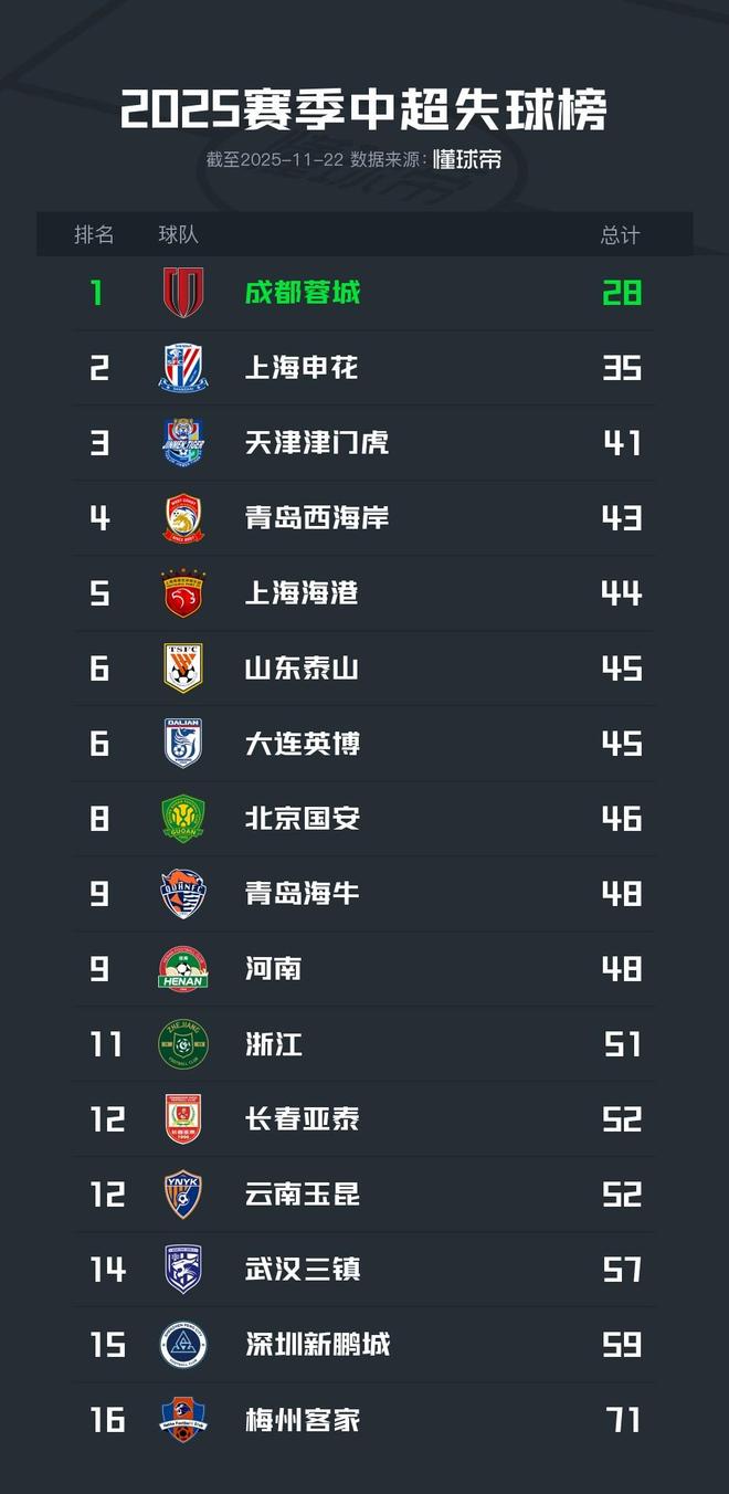 2025赛季中超丢球最少榜:1、成都蓉城 28球2、上海申花 35球3、天津津门虎 41球4、青岛西海岸 43球5、上海海港 44球6、大连英博 45球7、山东泰山 46球(图中数据有误)7、北京国安 46球9、青岛海牛 48球9、河南 48球11、浙江 51球12、长春亚泰 52球12、云南玉昆 52球14、武汉三镇 57球15、深圳新鹏城 59球16、梅州客家 71球