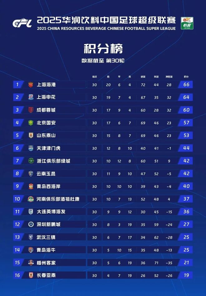 中超收官!海港三连冠梅州降级,武汉三镇第13