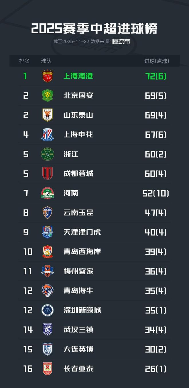 2025赛季中超进球榜:1、上海海港 72球2、北京国安 69球2、山东泰山 69球(此前数据未更新,现已更正)4、上海申花 67球5、浙江 60球5、成都蓉城 60球7、河南 52球8、云南玉昆 47球9、天津津门虎 40球10、青岛西海岸 39球11、梅州客家 36球12、青岛海牛 35球12、深圳新鹏城 35球14、武汉三镇 33球15、大连英博 30球16、长春亚泰 26球