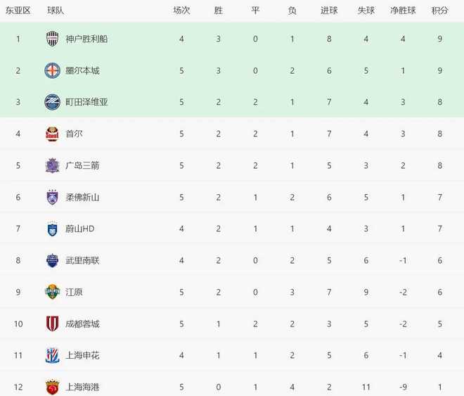 而中超两强的表现又恰好相反。中超4冠王上海海港继续一胜难求甚至可以说一分难求的尴尬。坐镇主场被首尔队3-1大胜,五轮比赛仅有1分入账,成为东亚赛区人见人欺的鱼腩球队。成都蓉城表现稍微好一些,虽然没能拿下对手,但主场1-1与广岛三箭队握手言和的结果,其实还是可以接受的。至此,第五轮首个比赛日结束之后,积分榜形成一个很明显的迹象,那就是前八球队分差非常小,从榜首的9分,到第8名的6分,最大分差只有3分。更加雪上加霜的是,目前中超三强无一队能够跻身前八。接下来第5轮第2个比赛日,排名第7名和第8名的球队都是少赛一场,他们还有一场比赛要踢,意味着与排名第10位的成都蓉城分差有可能进一步扩大。在只有取得前八的球队才可以晋级下一轮的情况下,中超三强很有可能无一队晋级。