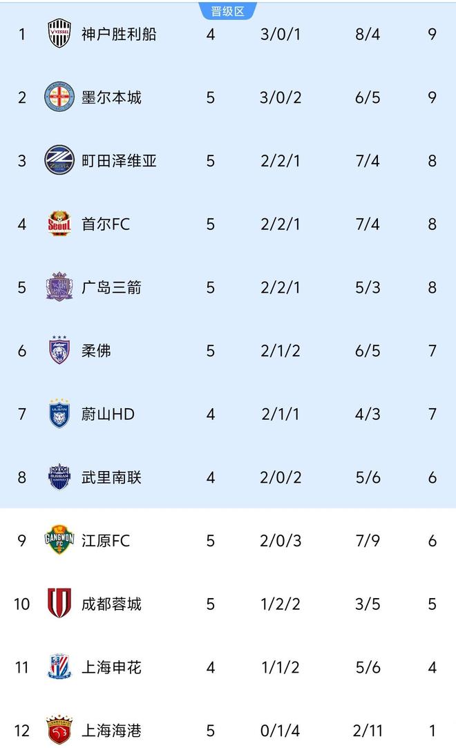 江原FC则坐镇主场迎战町田泽维亚。上半场进入20分钟之后,町田泽维亚15分钟内凭借仙头启矢、下田北斗、吴世勋的进球,半场3-0领先。下半场第55分钟朴何永帮助江原FC扳回一球,最终町田泽维亚客场3-1击败江原FC。最新积分榜方面,2支中超球队因未能取胜均无缘前8,成都蓉城本轮拿到1分之后积5分,先赛的情况下暂时反超上海申花升至第10,上港5轮1平4负仍仅积1分,继续排在积分榜垫底。在仅剩3轮比赛的情况下,上港想要挤进前8拿到晋级名额,就必须要3场比赛拿满9分。以球队目前应对亚冠的态度,可能性微乎其微。