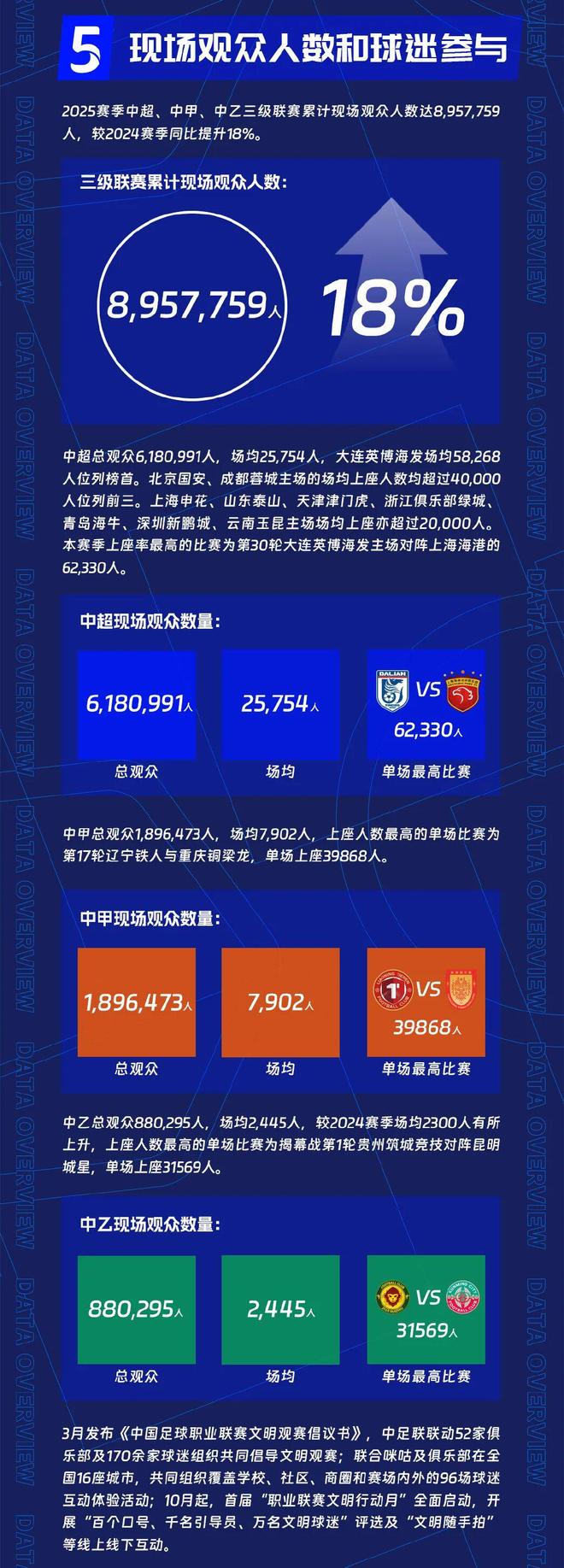 2025赛季中超、中甲、中乙三级联赛累计现场观众人数达8,957,759人次,较2024赛季同比提升18%。中超首次突破600万大关,较2024赛季的4663507人次相比,提升幅度高达32.54%。俱乐部层面,英博场均58268人次居首,国安和蓉城场均也超过40000人次。中甲总观众1896473人次,场均7902人。中乙总观众880295人,场均2445人。